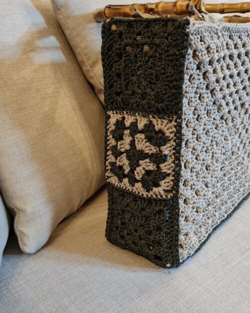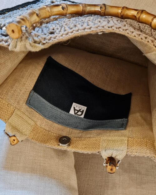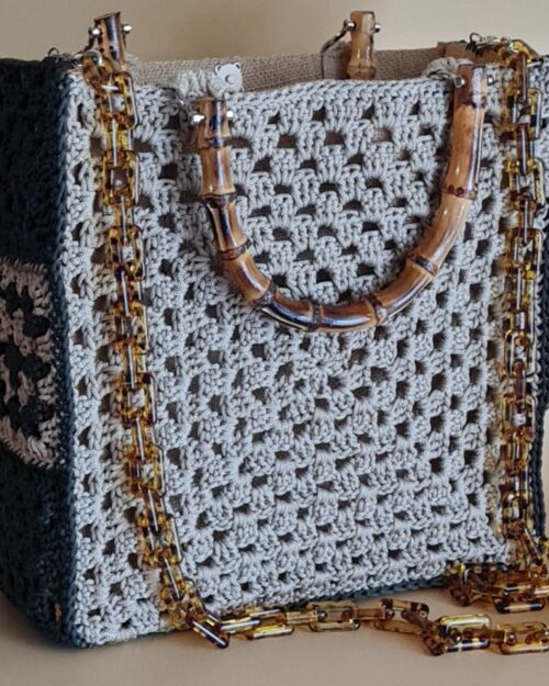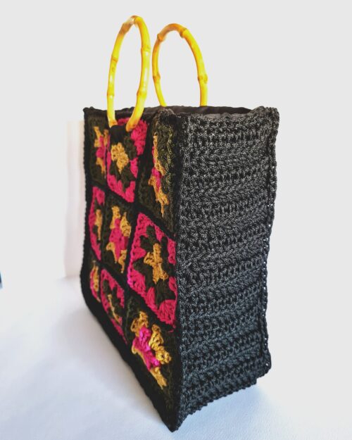 - Materiali: cordino in poliestere, fodera in tessuto spesso, manici in bambรน, rifiniture in metallo color oro. Misure: 30x30x10 Colori: nero, fucsia. verde militare, giallo senape