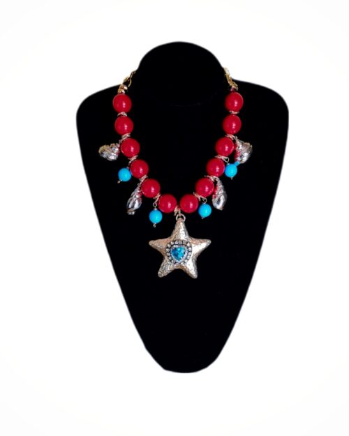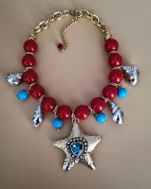 - Collana girocollo in resina con elementi marini Materiali anallergici: elementi in resina, catena in alluminio, chiusura in acciaio Lunghezza: 45 cm circa Colori: rosso, celeste