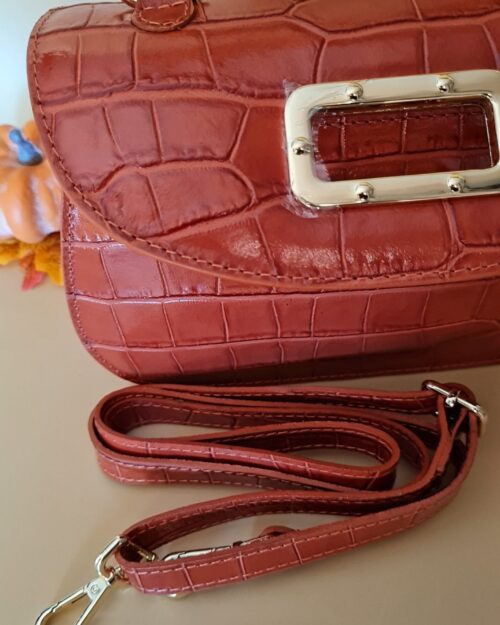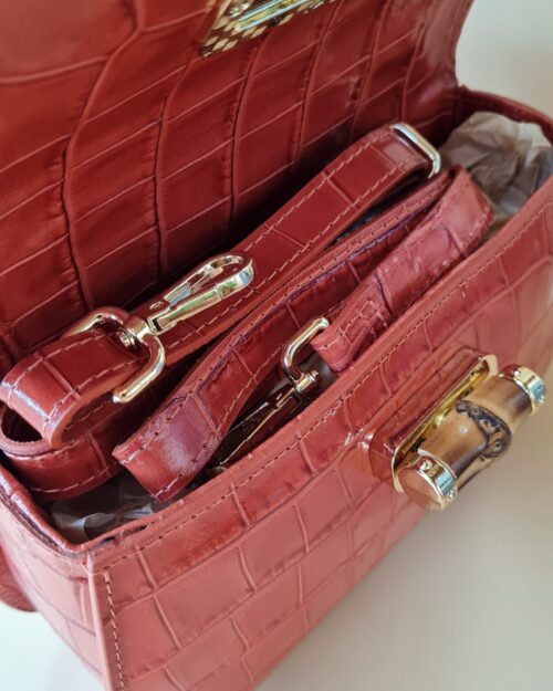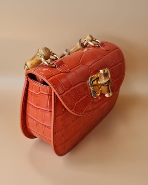 - Borsa in vera pelle stampa cocco con manici in bambรน color coccio Materiali anallergici: 100% vera pelle di vitello, minuteria in metallo dorato, fodera in tessuto. Misure: L. 22 cm,ย H.13 cm, P. 7 cm. Colore: arancione terracotta, oro.