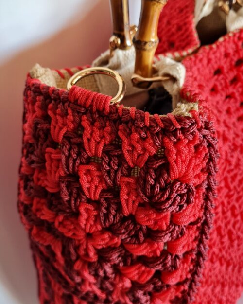 - Borsa rossa lavorata all'uncinetto Materiali: base in juta, manici in bambรน, cordino in poliestre Misure: 30x30 cm Colori: rosso, bordeaux