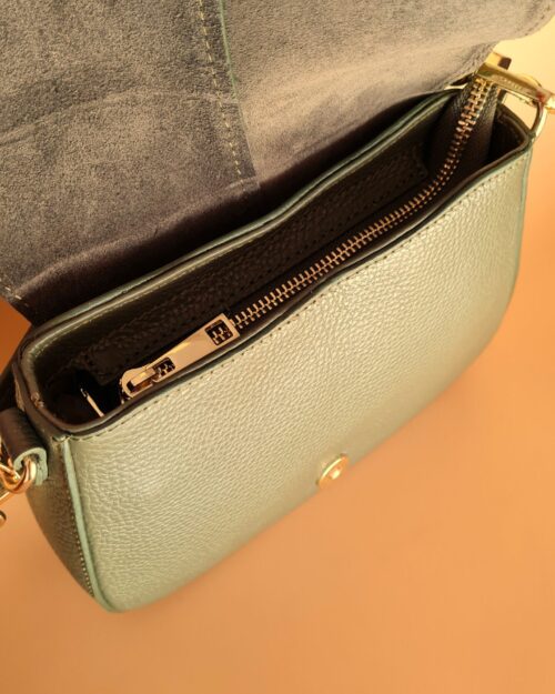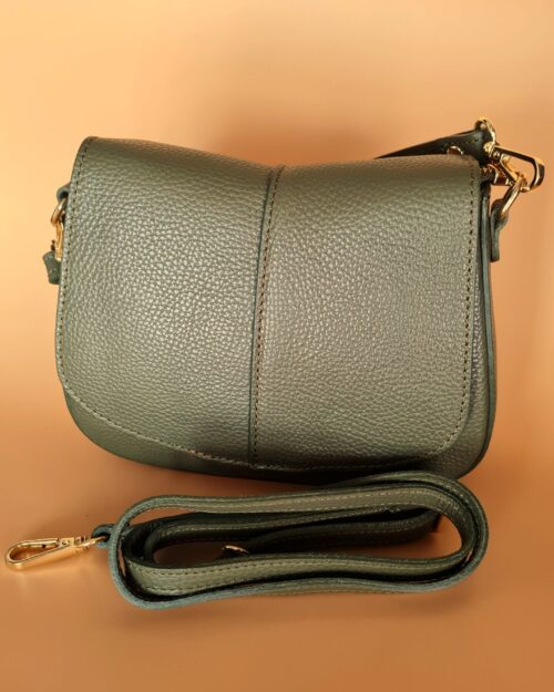 - Borsa in vera pelle color verde militare Materiali anallergici: 100% pelle dollaro, minuteria in metallo dorato, fodera in tessuto. Misure: L. 22 cm,ย H.16 cm, P. 6 cm. Colore: verde militare, oro.