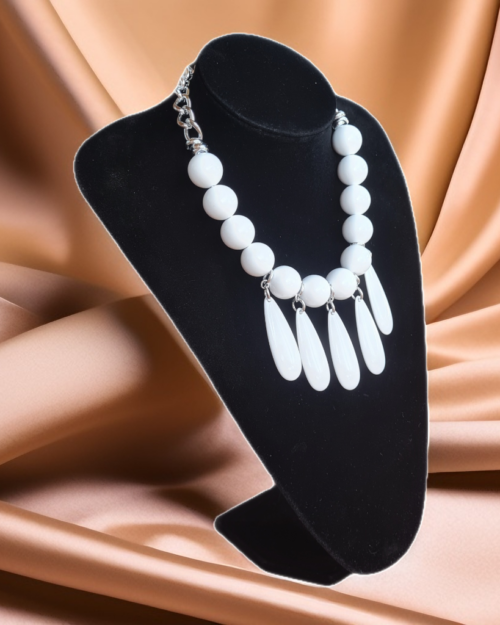 - Collana girocollo Materiali anallergici: elementi in resina. catena in alluminio Lunghezza 43 cm circa Colori: bianco, argento.