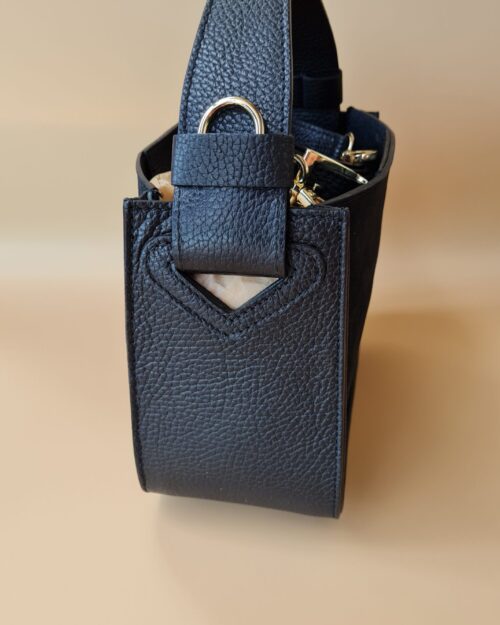 - Borsa in vera pelleย dollaro e camoscio nera Materiali anallergici: 100% vera pelle di vitello, minuteria in metallo dorato. Misure: L. 20 cm,ย H.17 cm, P. 10 cm. Colore: nero, oro.