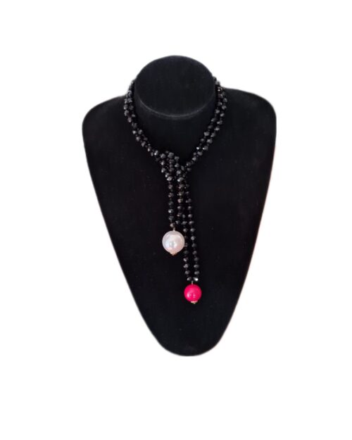 - Collana lunga con perle sintetiche annodate a mano Materiali anallergici: perle sintetiche, resina Misure: lunghezza 130 cm circa