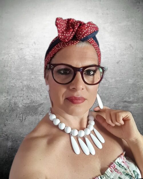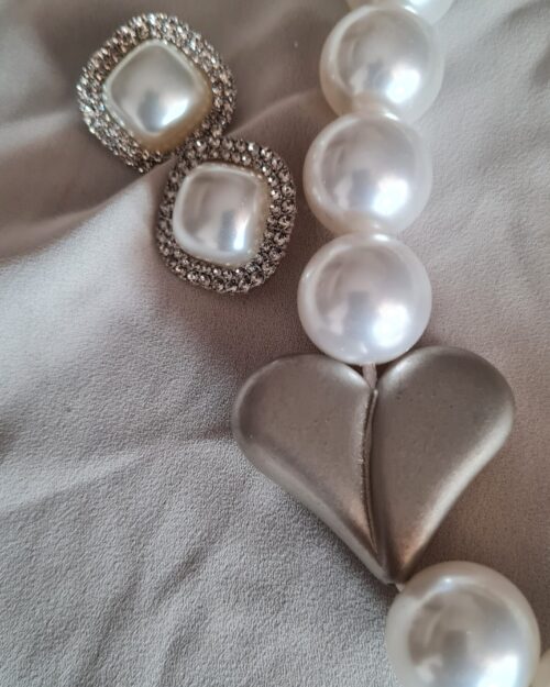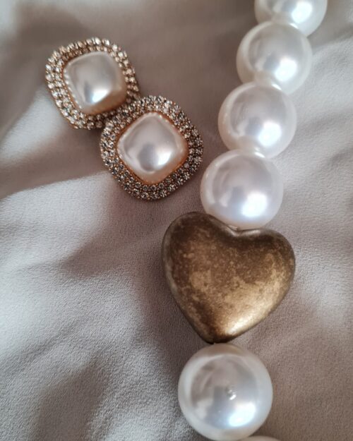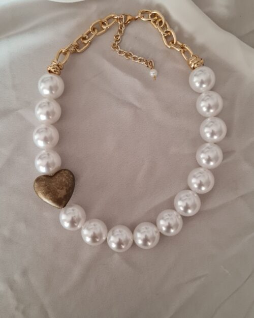 - Collana corta Colori: bianco perla, oro antico, oro Materiali anallergici: perle in resina, catena in alluminio color oro Lunghezza: 43 cm circa