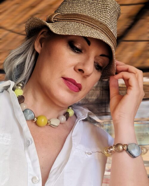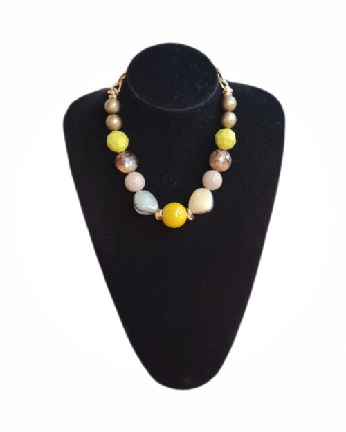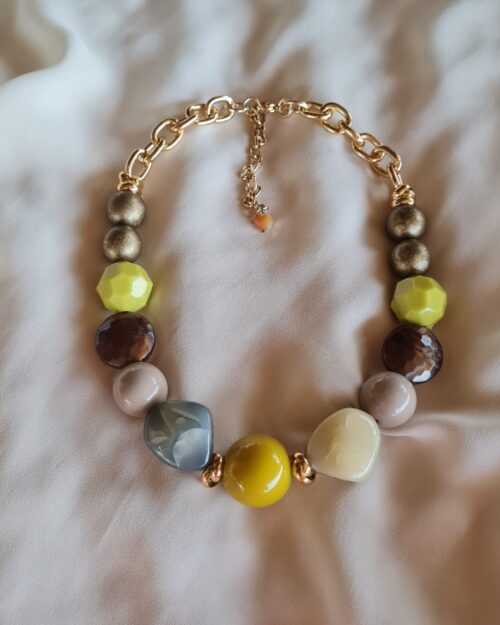 - Materiali anallergici: elementi in resina, catena in alluminio color oro Misure: lunghezza cm 43 + catenina di estensione di 7 cm Colori: giallo olio, lime, marrone, beige, oro
