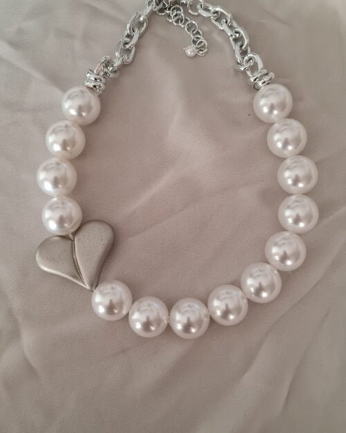 - Collana corta Colori: bianco perla, oro antico, argento Materiali anallergici: perle in resina, catena in alluminio color argento Lunghezza: 43 cm circa