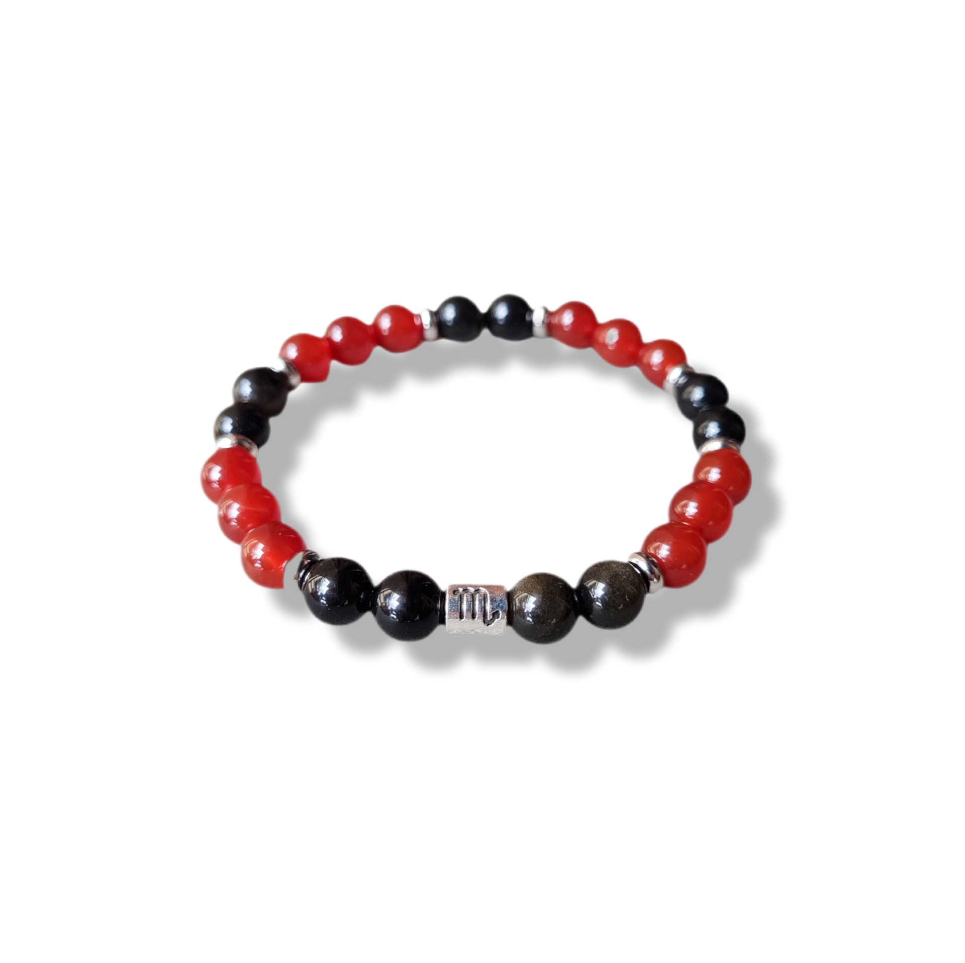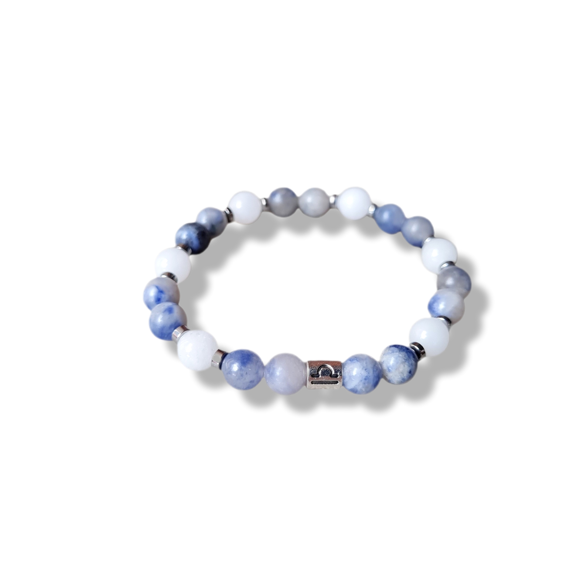 Bracciale elastico dedicato al segno della Bilancia (23 settembre – 22 ottobre), segno di Aria governato da Venere. E’ un segno estremamente diplomatico, non ama i conflitti, ricerca l’armonia e l’equilibrio in tutto ed ha un forte senso estetico e della giustizia. La necessità di valutare bene tutte le possibilità, prima di prendere una decisione, la rende spesso insicura e indecisa. Il suo Chakra di riferimento é quello del cuore e le pietre più adatte sono: la sodalite, il lapislazzuli, il quarzo rosa e la pietra di luna. La combinazione scelta per questo bracciale unisce la sodalite alla pietra di luna. La prima é utile per favorire la chiarezza mentale e prendere decisioni consapevoli, limitando l’indecisione tipica della bilancia, mentre la pietra di luna la connette con la parte femminile, amplificando il suo senso di equilibrio e di calma interiore, riducendo lo stress.