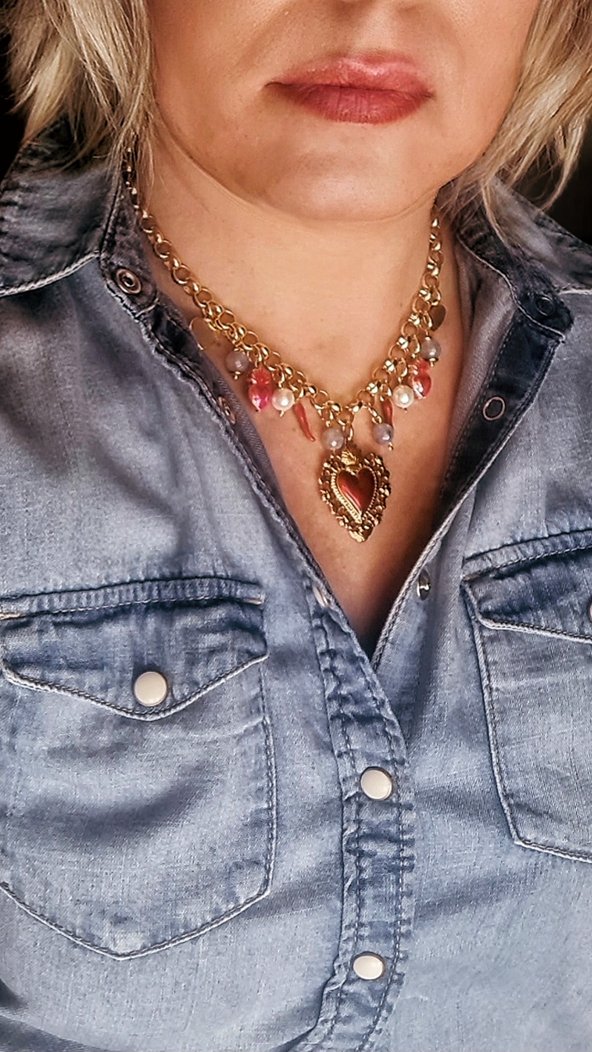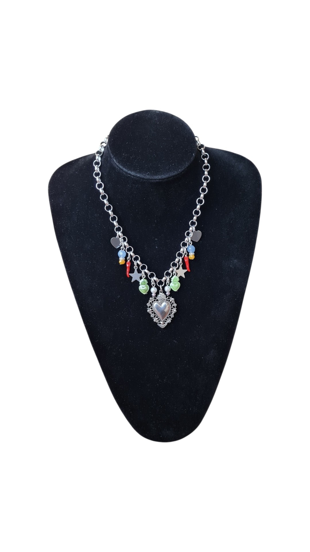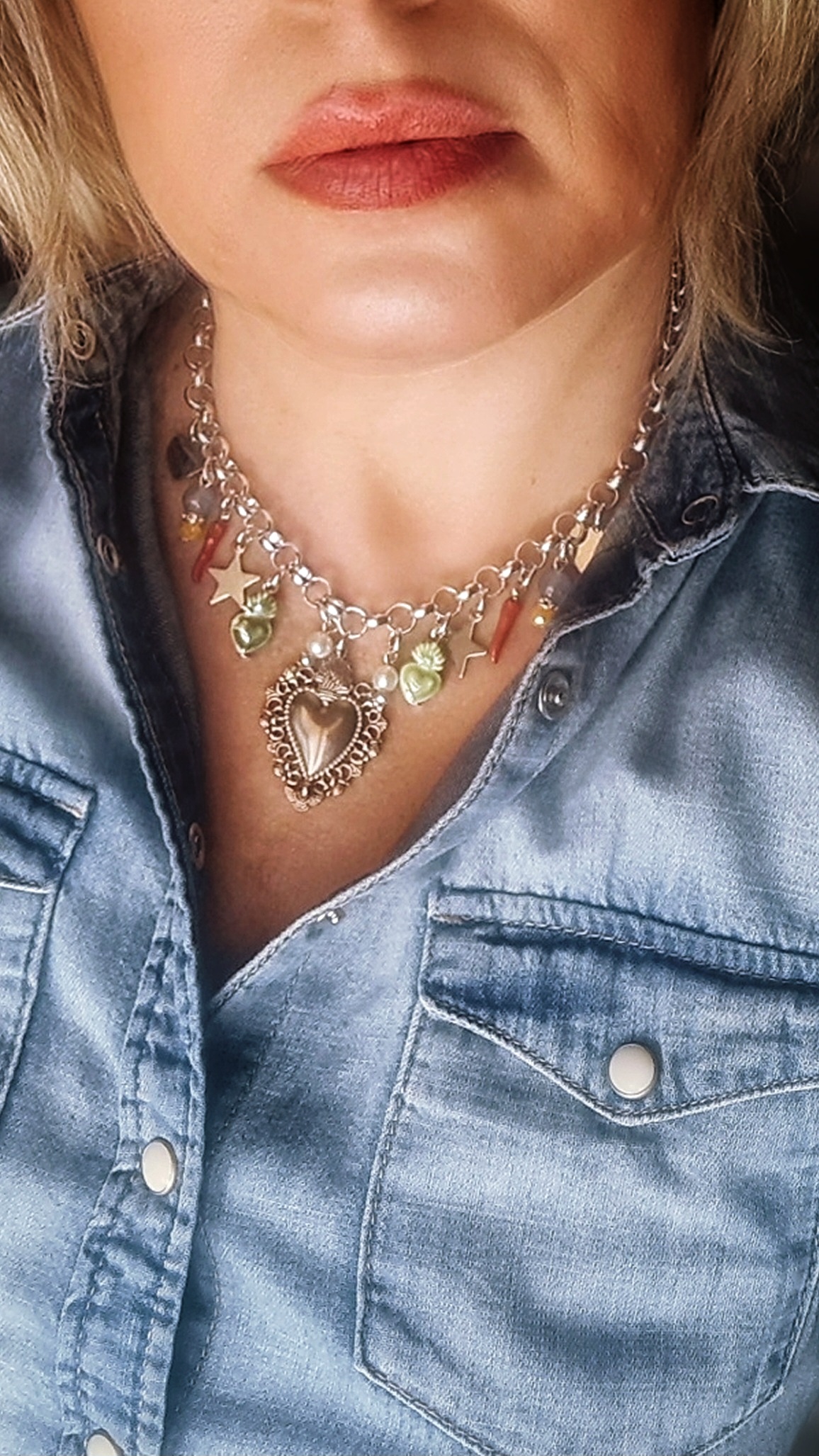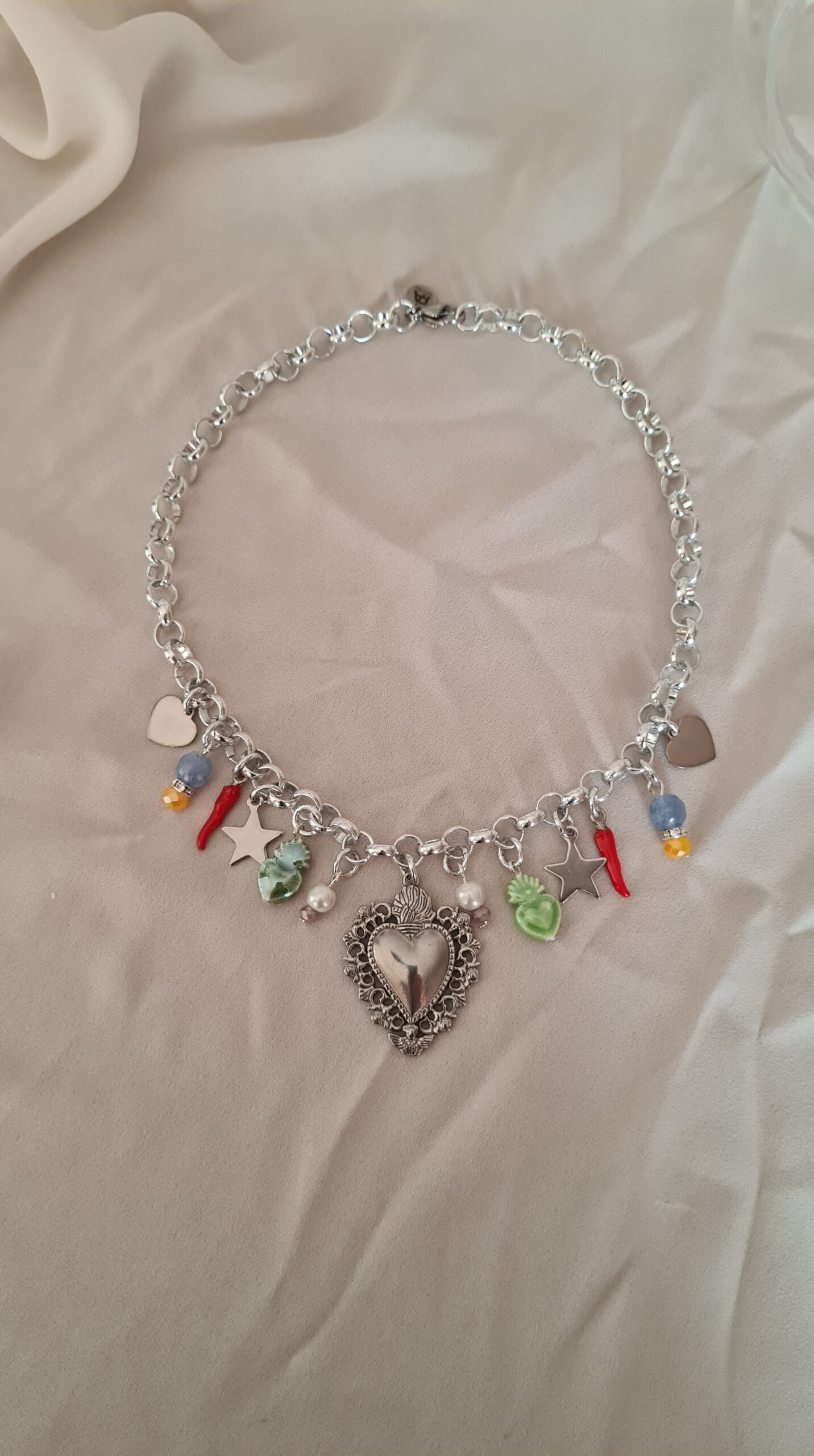 Collana girocollo realizzata con catena in alluminio argentato e piccoli pendenti a scalare di vari materiali ( pietre dure, resine, cristalli e ceramica). Un accessorio divertente e colorato, adatto a tutte le età e indossabile per tutto il giorno, grazie alla leggerezza della catena in alluminio, che lo rende comodo e luminoso.