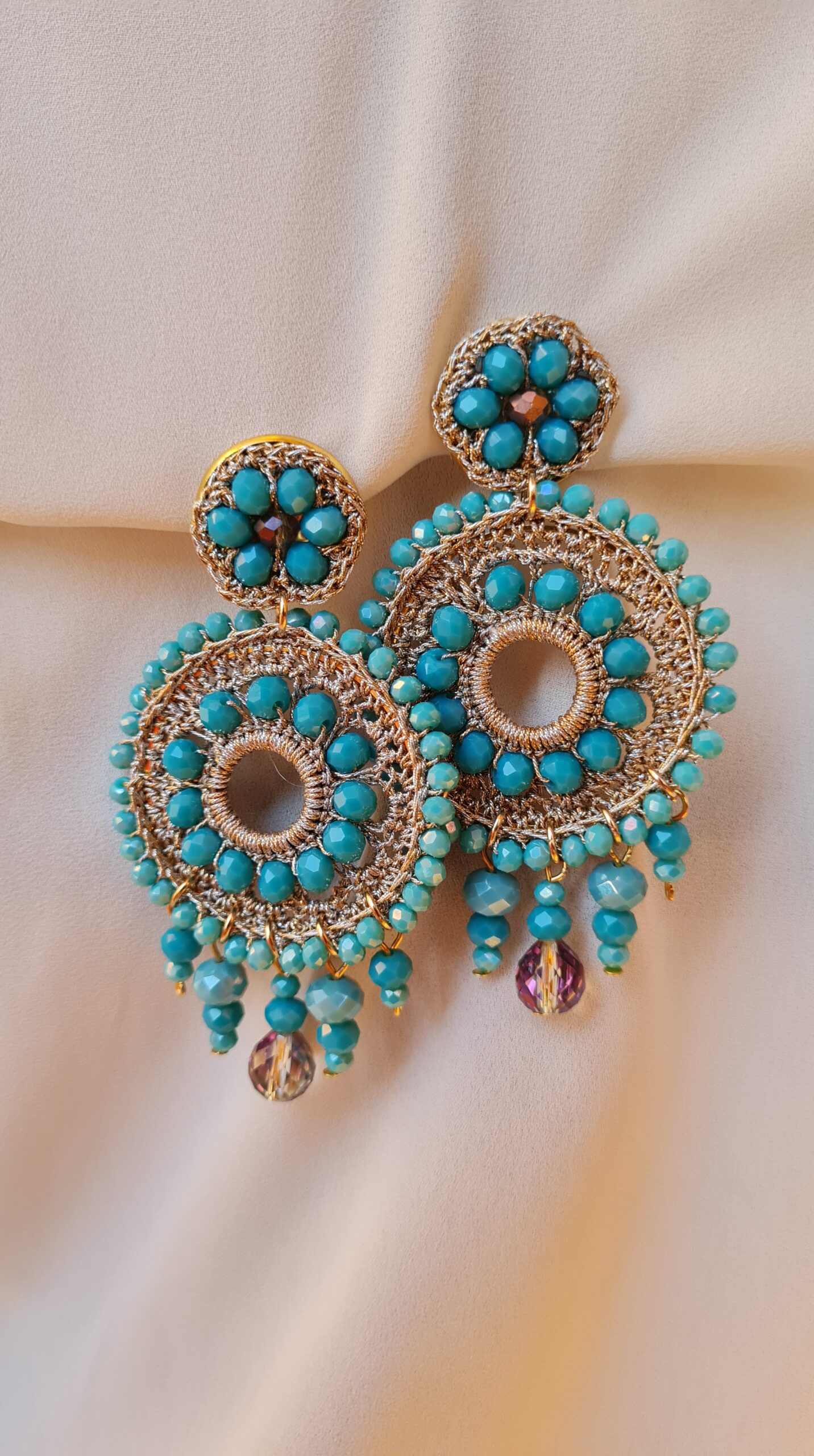 Orecchini Mandala, con cristalli color turchese realizzati all’uncinetto
